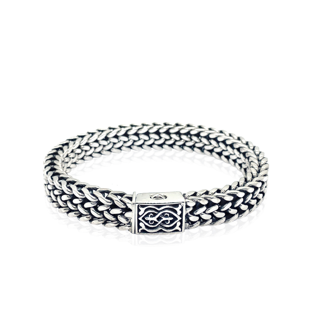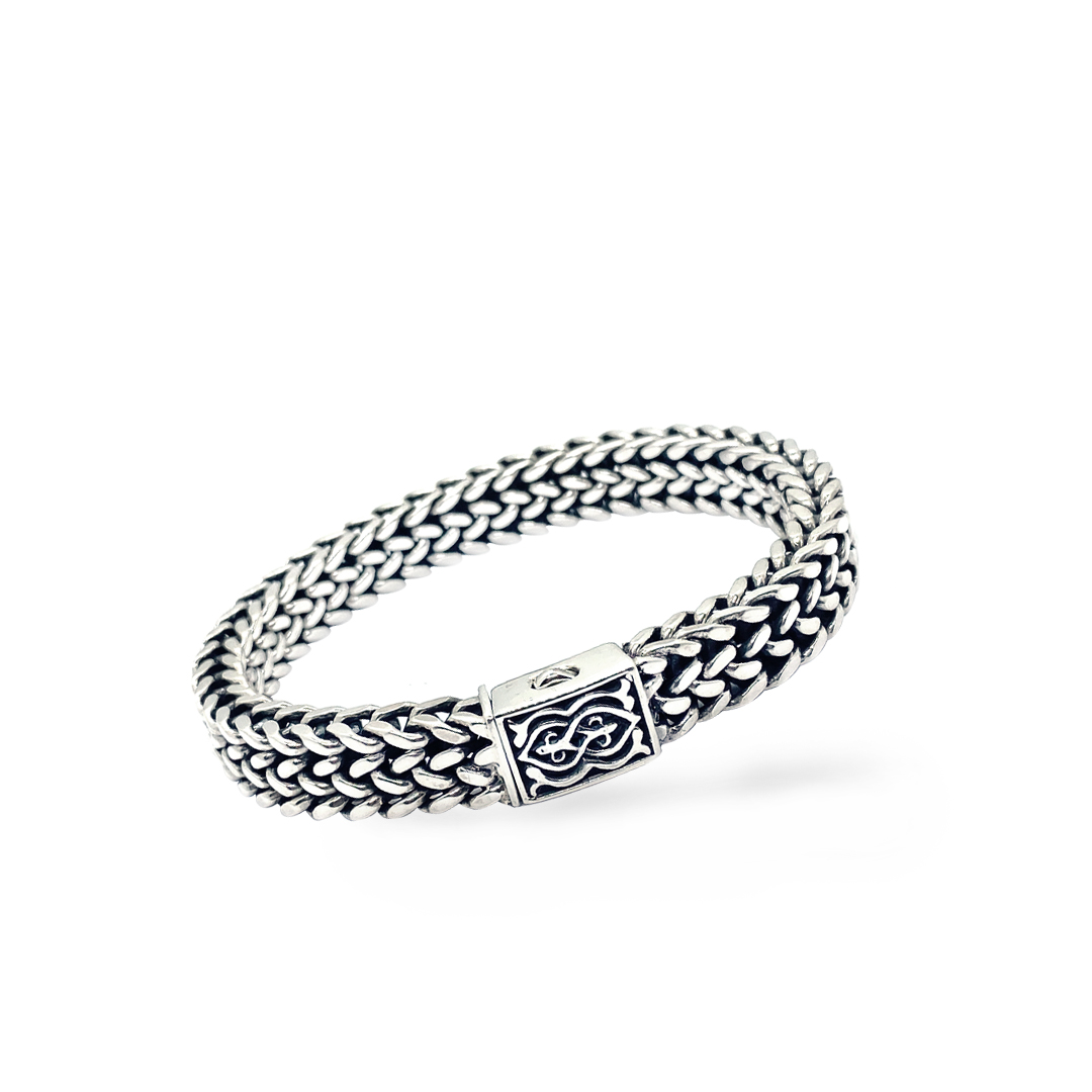 The 10x6mm Handcrafted Sterling Silver Bracelet with Filigree Pyramid Closer showcases intricate Balinese filigree work, a technique passed down through generations. The pyramid-shaped clasp symbolizes strength and stability, reflecting the deep cultural heritage of traditional silver craftsmanship. A timeless piece of elegance and artistry.