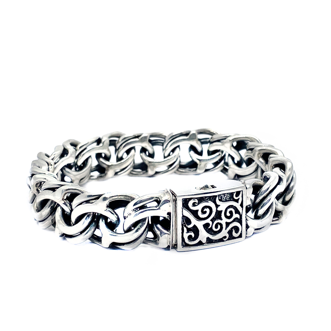 The 13mm Sterling Silver Infinity Bracelet with Toraja Closer blends cultural symbolism with exquisite craftsmanship. The infinity design represents eternal connection and balance, while the Toraja-inspired clasp reflects the rich heritage of ancestral traditions. This bold yet elegant piece embodies strength, unity, and timeless artistry.