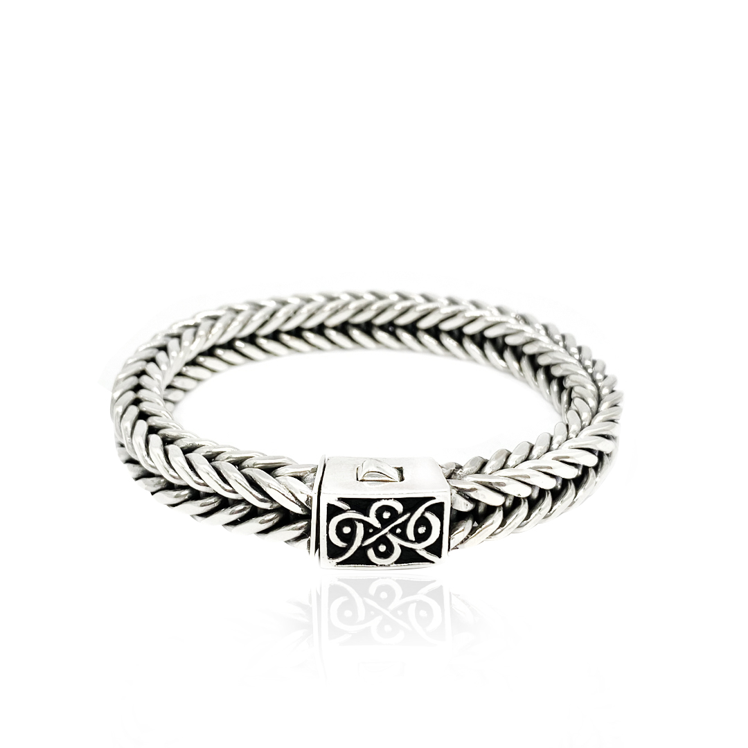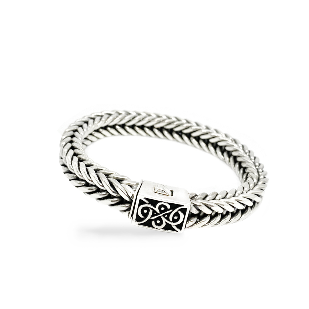 Sterling Silver 10mm Square Dragon Bones Bracelet with Decorative Piramid Closer