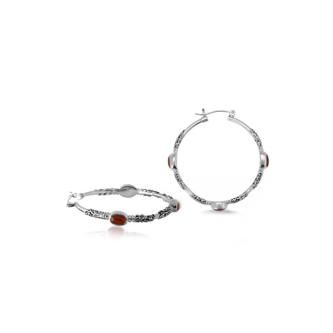 The Handcrafted Sterling Silver Filigree and Granulation Hoop is set with three 4x6mm Carnelian stones, symbolizing vitality, courage, and passion. Balinese filigree and granulation techniques enhance its intricate beauty, reflecting traditional craftsmanship and spiritual energy. A timeless piece of artistry and strength.