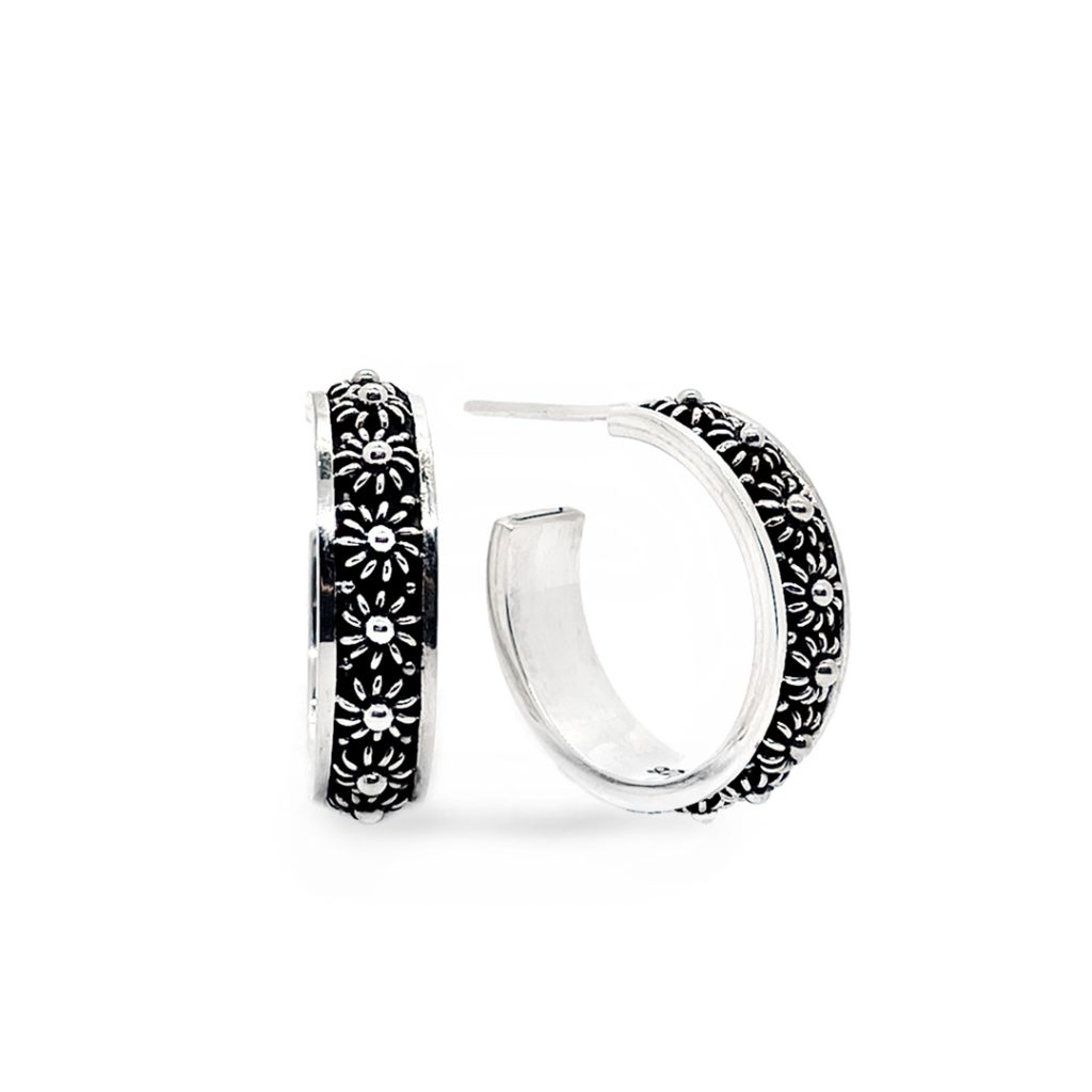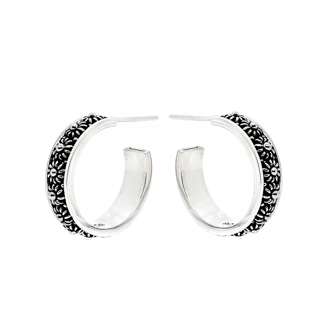The Sterling Silver Flower Decoration Hoop with Post embodies Balinese elegance and craftsmanship. The delicate floral motifs symbolize growth, beauty, and harmony with nature, reflecting traditional Balinese artistry. Meticulously handcrafted, these hoops blend cultural heritage with timeless sophistication, making them a graceful statement of style.