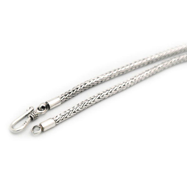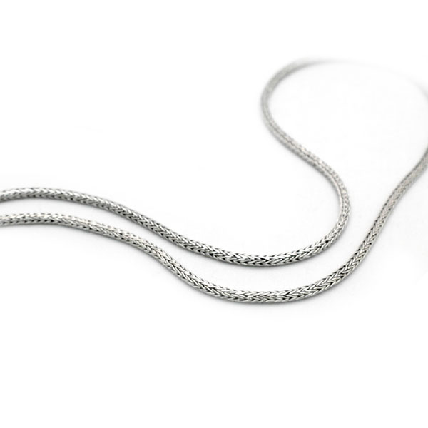 Sterling Silver 2.5mm Tulang Naga Chain with Plain Closer. This Tulang Naga chain features an intricate woven silver design with a 2.5mm width, offering a sleek and versatile look for any occasion. The Tulang Naga motif, deeply rooted in Indonesian jewelry craftsmanship, symbolizes strength, protection, and prestige. Finished with a simple plain closer for a minimalist yet refined aesthetic.