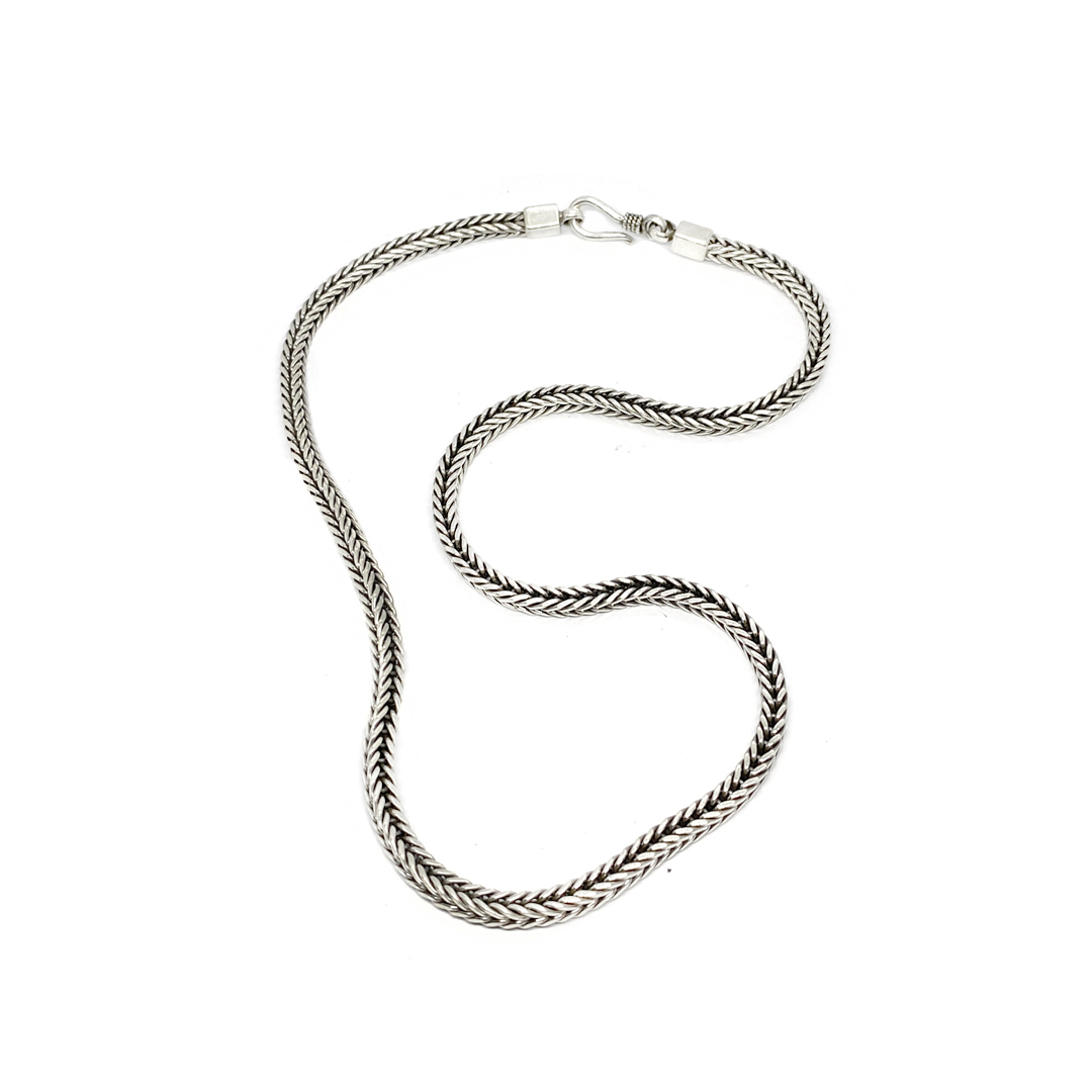 The 4mm Tulang Naga Kotak Necklace with Hook Clasp features a distinctive box-weave design, inspired by the legendary Naga (dragon) in Balinese culture, symbolizing strength, protection, and resilience. Handwoven with precision, this piece embodies timeless craftsmanship and heritage.