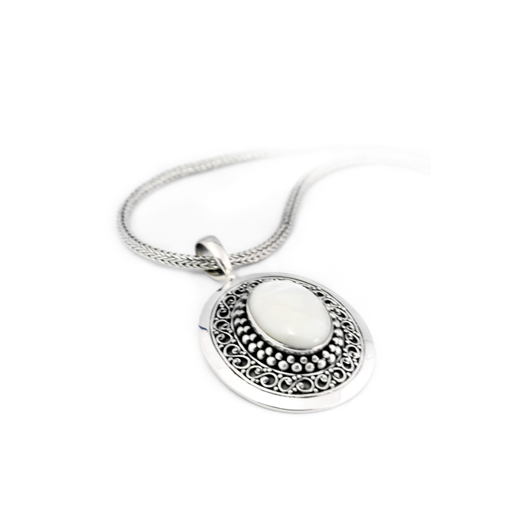 Handcrafted Sterling Silver Pendant Filigree set with Mother of Pearl is an elegant piece that combines intricate silver filigree artistry with the natural beauty of Mother of Pearl (MOP). Known as a symbol of purity, tranquility, and wisdom, MOP has been cherished across cultures, including in Bali, where the sea represents balance and spiritual energy. The detailed filigree work enhances its timeless and sophisticated appeal, making this pendant a perfect choice for those who appreciate beauty with deep meaning.
