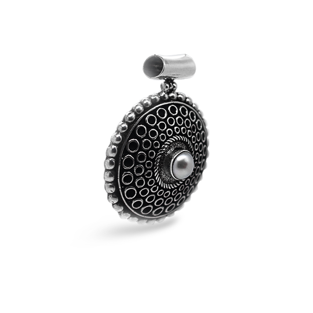 Round Hale Pendant with 8mm Fresh Water Pearl is an elegant circular pendant with a 25mm diameter, featuring an 8mm freshwater pearl. Pearls symbolize purity, wisdom, and inner peace, while the circular design represents perfection and natural harmony. With intricate filigree detailing and the pearl’s natural luster, this pendant is the perfect choice to add a touch of timeless elegance and meaning to your style.