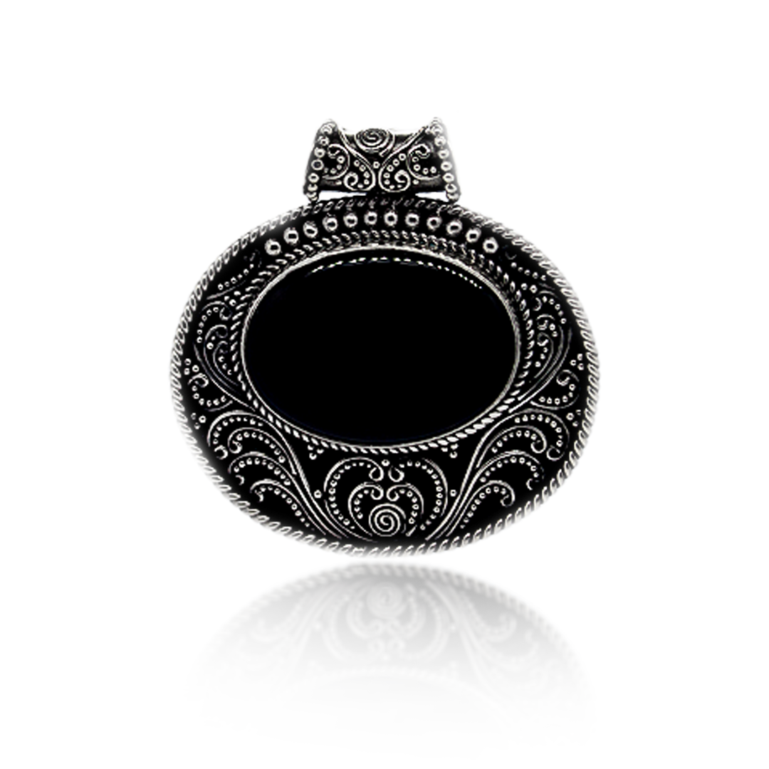 Sterling Silver Filigree and Jawan Pendant with Onyx Stone is an exquisite sterling silver pendant featuring intricate filigree and jawan (granulation) techniques. The central black onyx stone symbolizes serenity, protection, and inner strength. In Balinese culture, filigree and jawan craftsmanship represent meticulous artistry and traditional beauty, making this pendant more than just jewelry—it embodies resilience and energy balance.