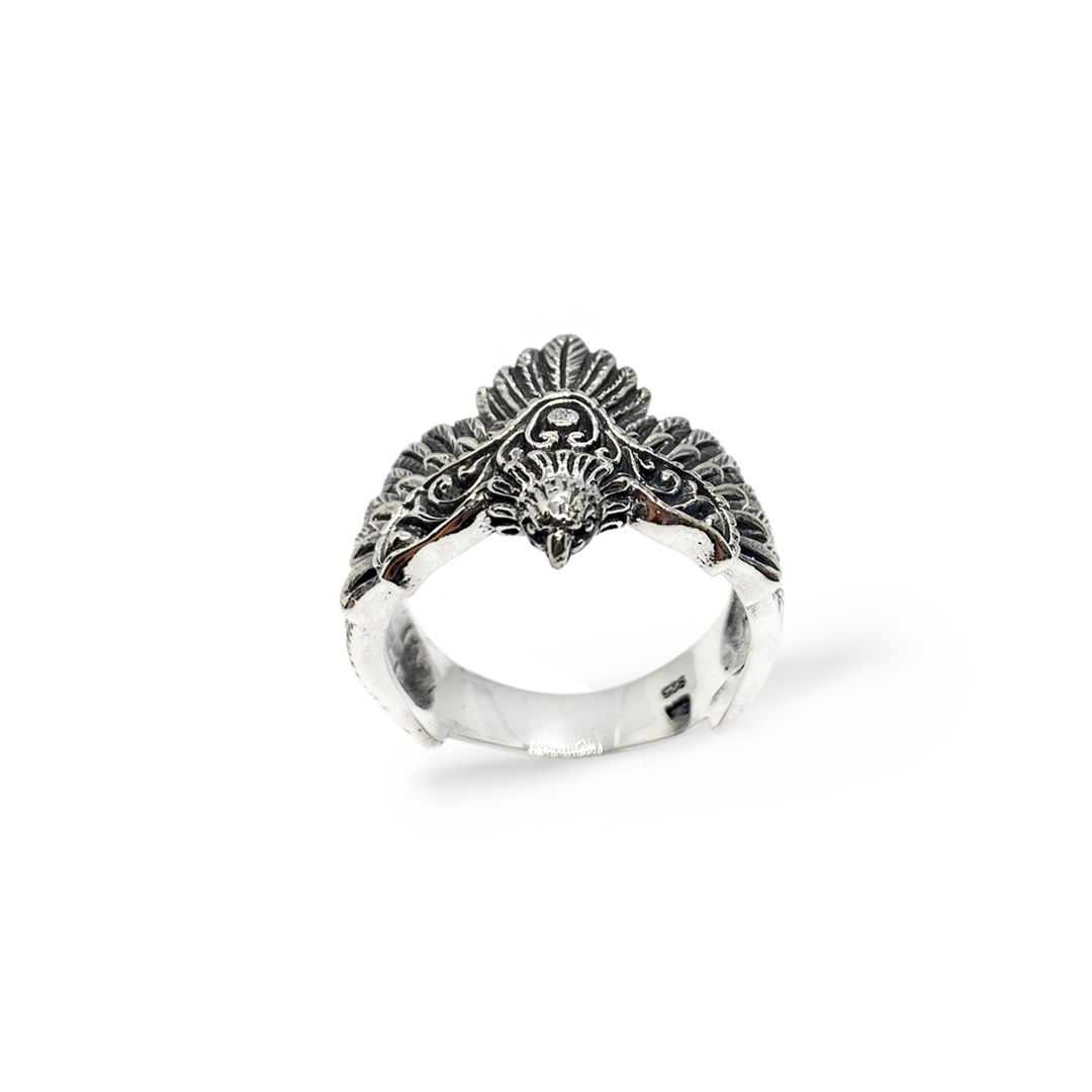Sterling Silver Eagle Ring with Filigree. This sterling silver ring features an intricately designed eagle motif, symbolizing courage, freedom, and strength. Decorated with fine filigree details, it showcases expert craftsmanship, creating a piece that is both elegant and meaningful. Perfect for those who want to express a bold and authoritative style.