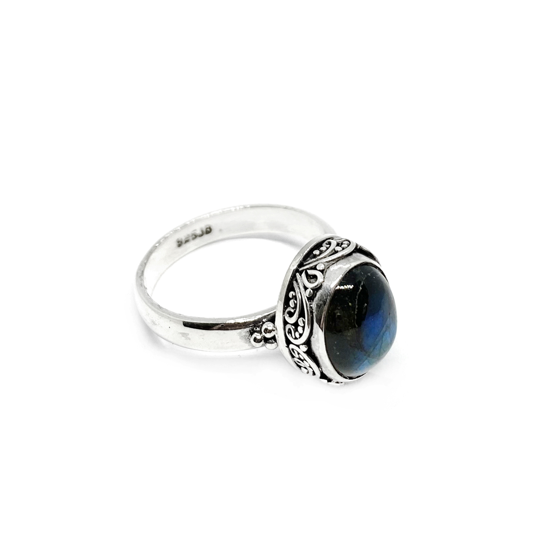 A classic sterling silver ring featuring an intricate filigree design and a 10×12mm oval Labradorite gemstone. The Labradorite stone showcases an enchanting play of colors, including blue, green, and gold hues, making each piece unique. Handcrafted with precision, this ring offers a timeless elegance with an artisanal touch.