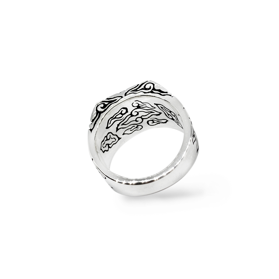 A sterling silver ring featuring the iconic Mega Mendung motif, inspired by the traditional Cirebon batik pattern that symbolizes serenity and wisdom. The flowing cloud-like design creates a unique and elegant aesthetic. Handcrafted with precision, this ring blends cultural heritage with contemporary style.