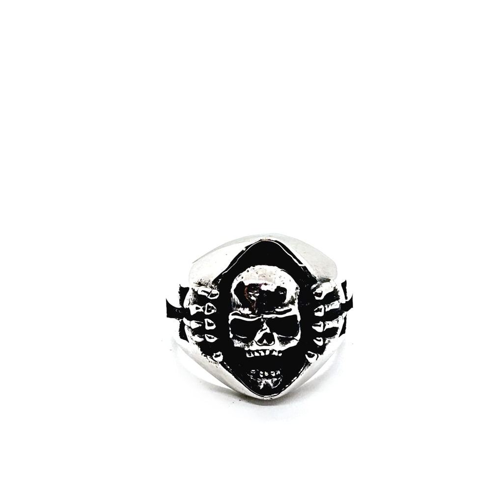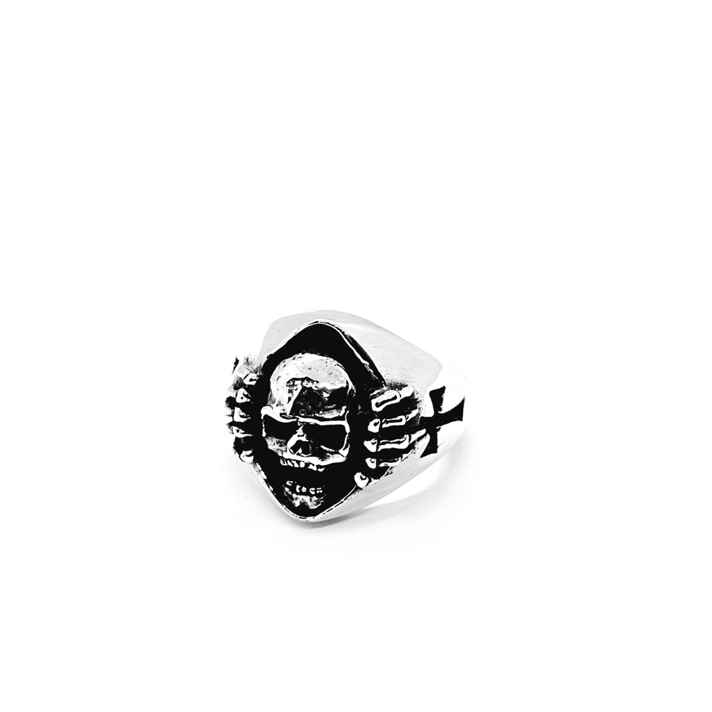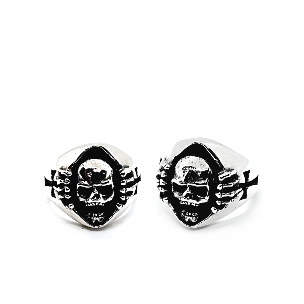 A sterling silver ring featuring a skull holding faces design, creating a mysterious and bold look. The intricate carving details make it an ideal choice for gothic and biker style enthusiasts.